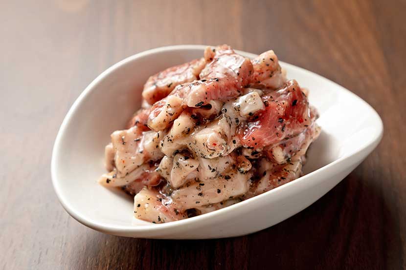 通常部位のほか、塩だれを揉みこんだ「塩ジンギスカン」も当店の名物メニュー。焼いた後、タレにつけずそのまま食べるスタイルで、ラム肉の美味しさをダイレクトに味わえる逸品。溶岩プレート鍋も含め、既存のスタイルや食べ方にとらわれず、柔軟な発想で美味しいジンギスカンをご提供するのが「たまり」流です。